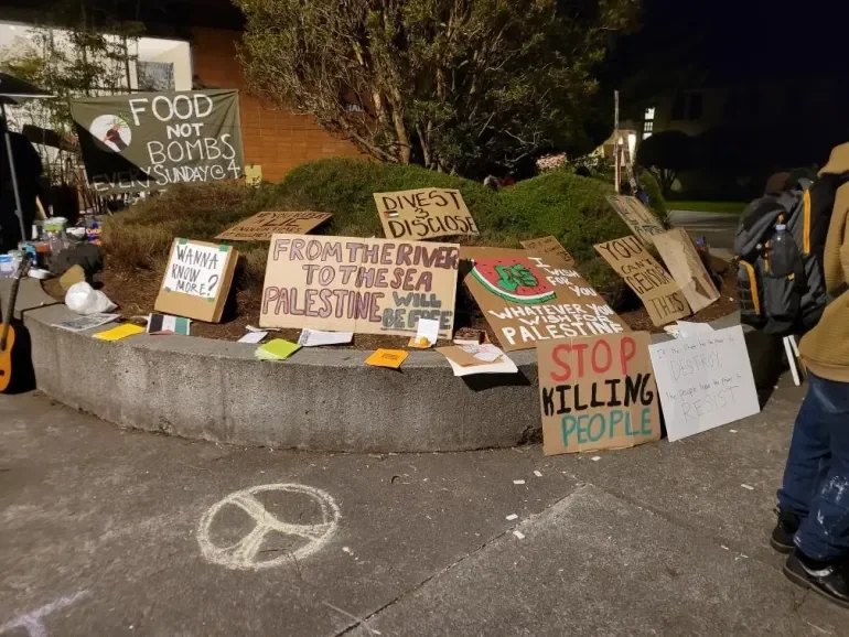 What happened is that PSC, our Palestine Solidarity Committee, put out a [social media] post the day before, on April 23, saying that we’re going to occupy the lawn from 1 to 7 pm. They had posted a schedule with teachings, art workshops,